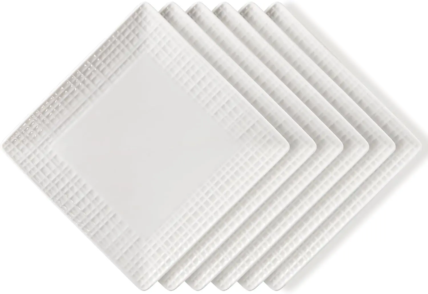 Clean, crisp white porcelain appetizer plates combines squares shape and stripe in a dynamic contemporary design. Our durable dessert plate resists chips and stains and is safe to use in the dishwasher, microwave and oven. The white square dinner plates are appropriate for meals ranging from casual weeknight dinners to formal dinner parties.